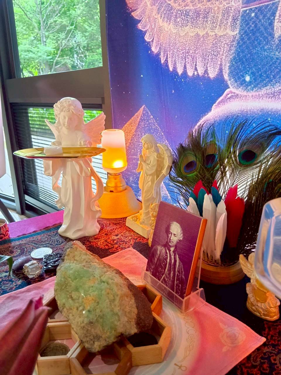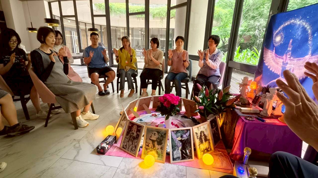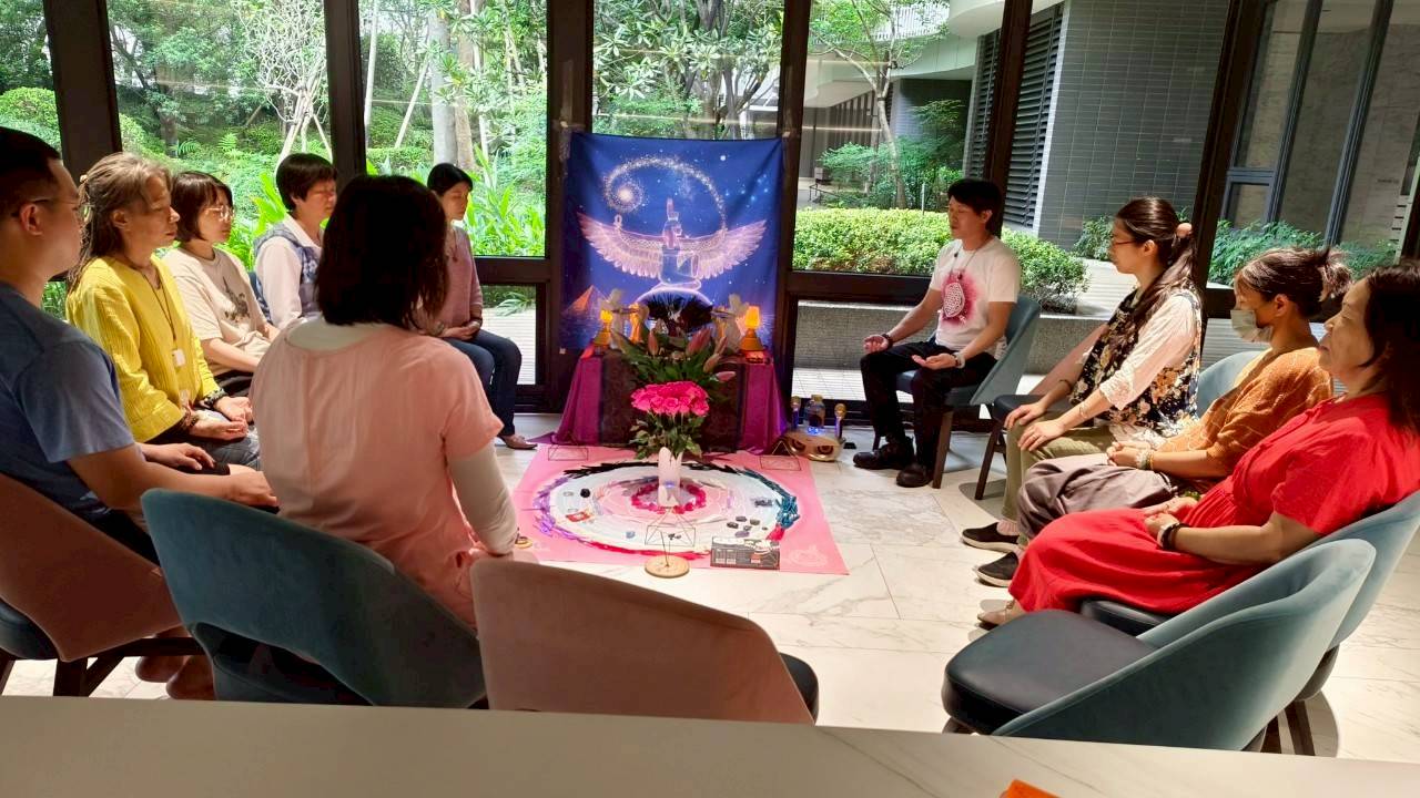 大夥到達時聖壇已經佈置的美輪美奐,愛希斯女神的能量掛布映入眼簾,桃紅色的百合花與玫瑰花散發撲鼻香氣,桌上佇立著女神與天使的雕像,一圈圈圍繞聖壇的彩色羽毛象徵蛻變與豐盛的意象,走進聚會場地很容易就沉浸在神聖女性源源不絕的大愛浪潮中。