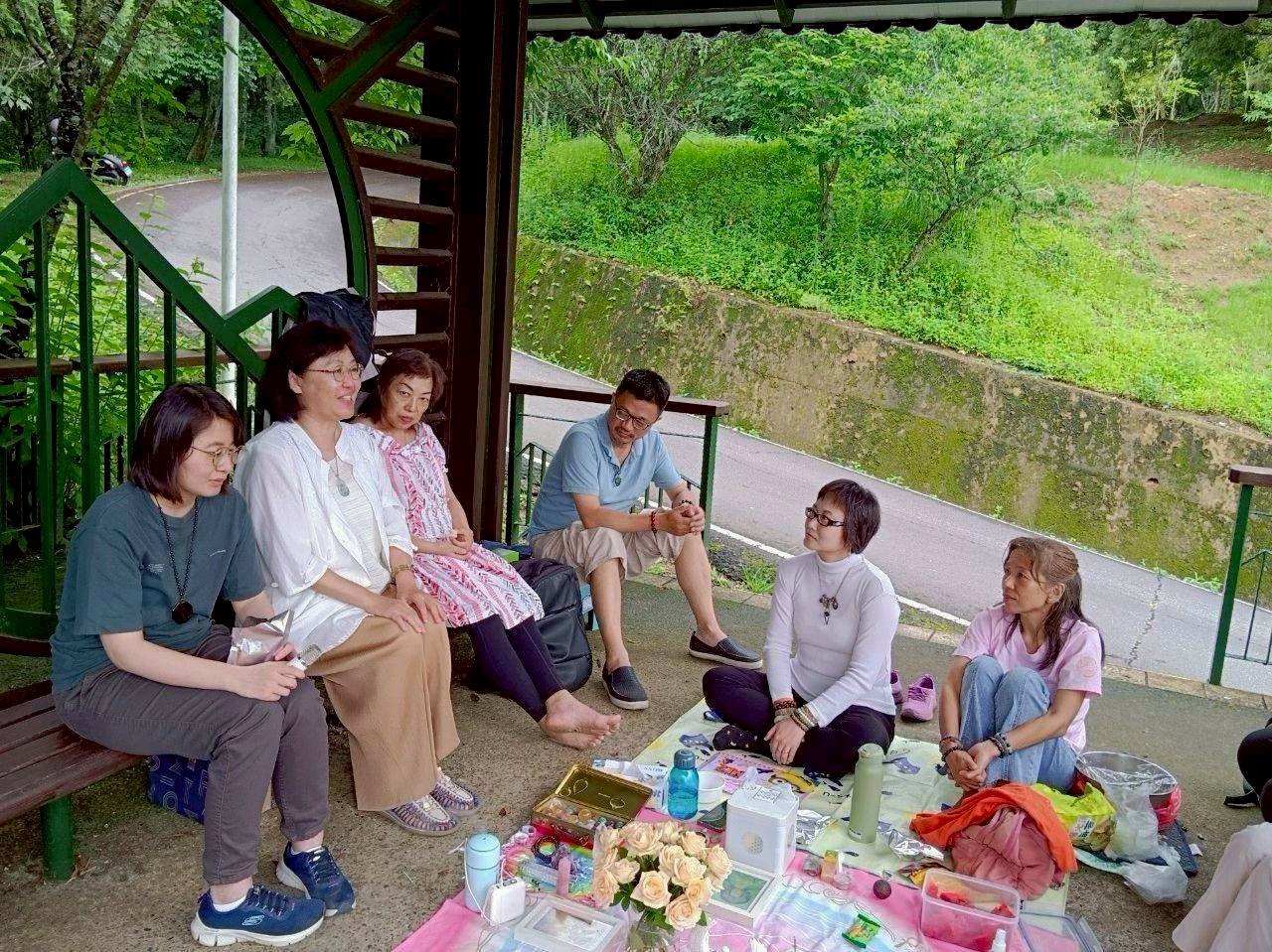 以往聚會都在潭邊湖岸,這次是在地點較為隱蔽的“金龍山”,幽然山境感覺能量很乾淨,清風徐來煞舒爽;小小涼亭匯聚13位光們,驚喜發現有3位是4、5月參加培訓的新學員👏。