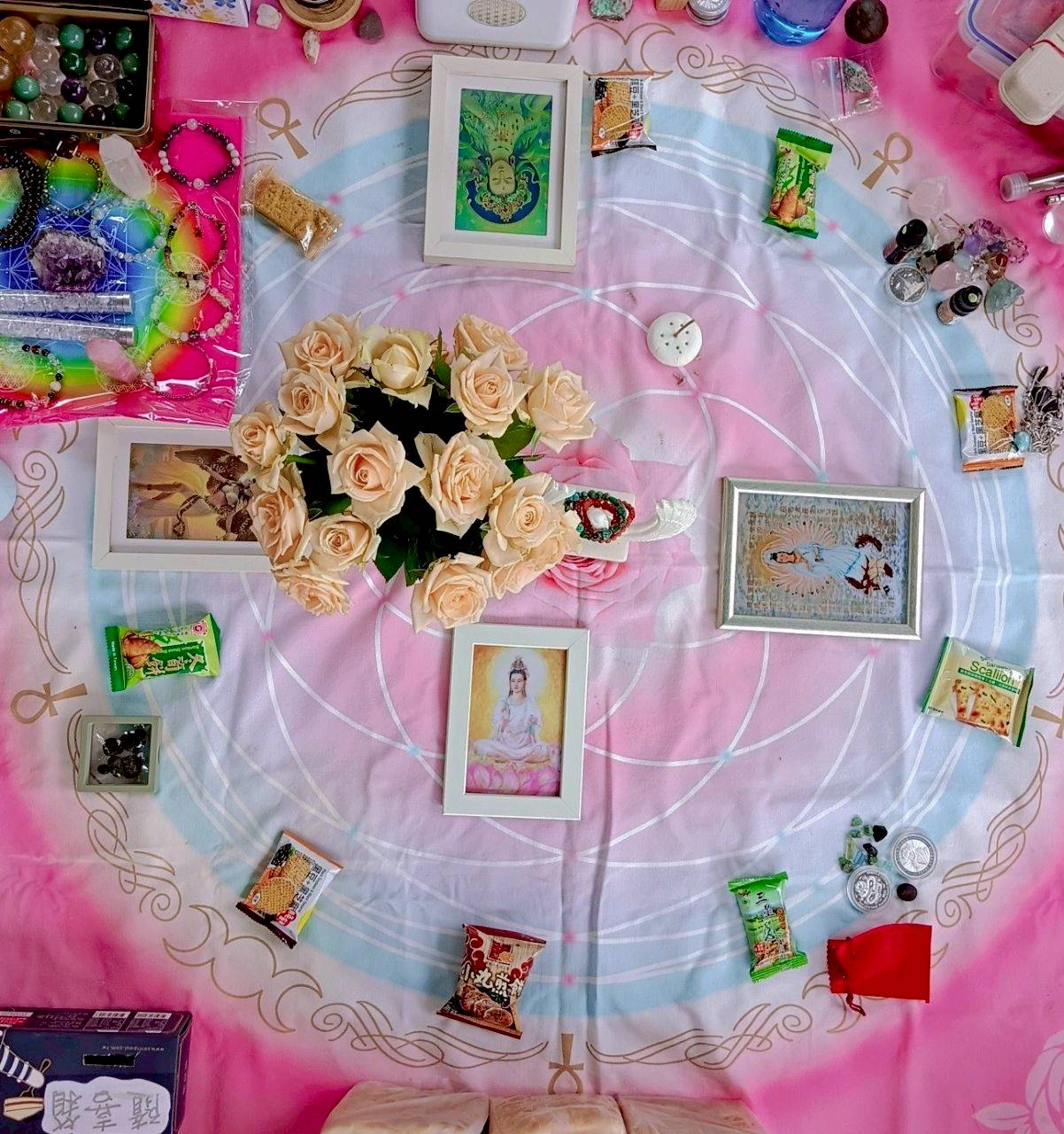 當我們齊聚,心中各自懷抱著祈願與靜默的期待,細雨輕拍肩頭,像是女神溫柔的祝福。我們一起布置神聖空間,點燃蠟燭與薔薇香氛,進行祈請與宣言。薔薇聖女團的神聖宣言在雨霧中顯得格外有力量,如同點燃一道通往高維的光門,為我們今日的所有靈性工作打下穩固基礎。