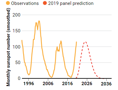 2019 年,當太陽接近活動極小時的時候,十幾位科學家齊聚一堂進行一項例行公事:預測太陽下一次進入極大期的時間點。隨著太陽活動再度變得活躍,美國太空總署、國家海洋和大氣管理局和國際太空環境服務組織(International Space Environment Service )共同組成的專家小組顯然預測失準了。太陽的活躍程度已經超過了預期,而且達到了 20 年來從未見過的水平。太陽可能會在就達到活動最大期,進度比預計的時間提前幾個月。奧盧大學物理學家伊利亞-烏索斯金表示:”顯然,專家小組低估了太陽活動。