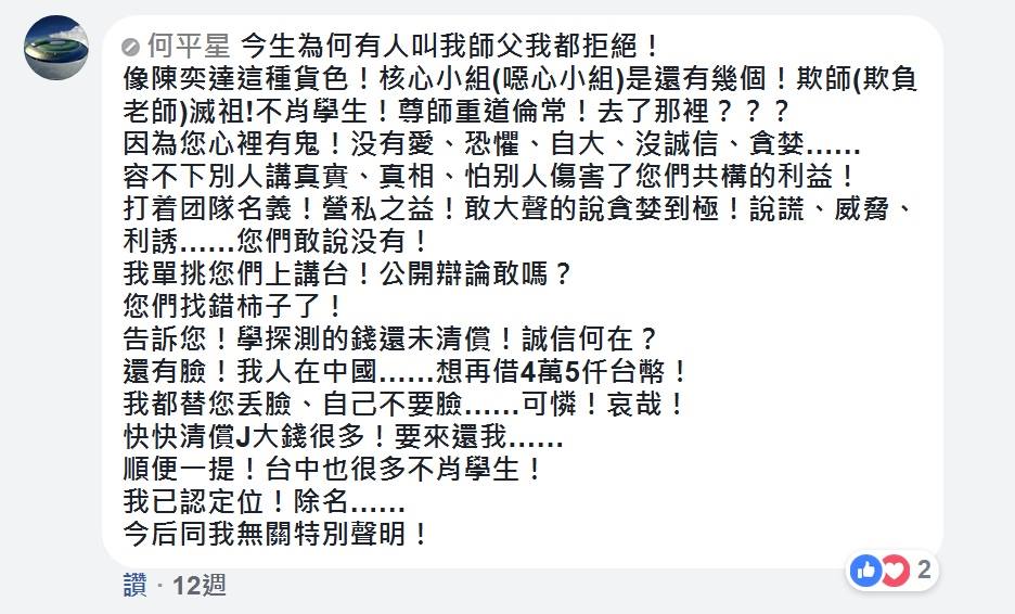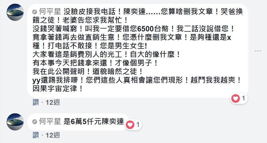 他在團隊臉書社團對我突如其來,非常惡劣的攻擊,真是讓我非常痛苦;因為,在那個時期,我自己正面臨很大的壓力,也用盡方法改善自己的狀態,已經是精疲力盡了;不料,從未跟我提及要還錢的事,一出手, 就是在FB社團公然辱罵, 好像我有多麼不堪,故意欠他不還,一直在閃避他似的;請參照當天的對話截圖!