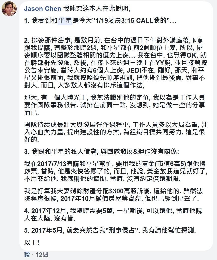 2017 年,在他宣布離開國際黃金時代團隊的那一天,突然有光工打電話給我,說和平星在FB實體聚會社團攻擊我 ,我不知道發生什麼事,於是去看臉書內容。我跟他過去並沒有私人恩怨,他突如其來的粗暴言詞讓我驚訝。