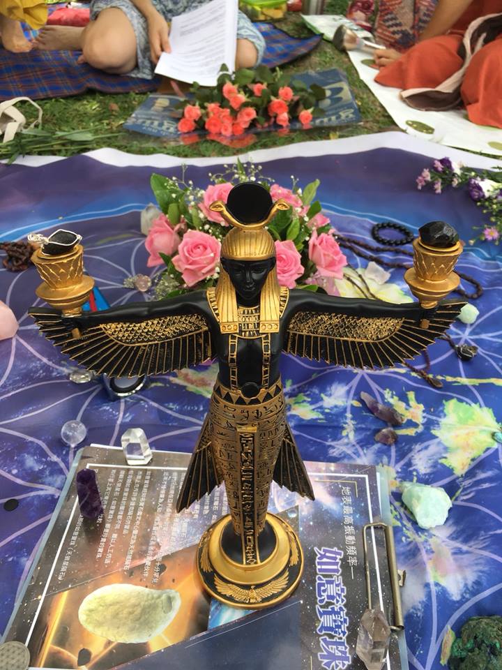 家人們陸續抵達,這些聚會的元素接續拼湊出來,捧著鮮花的楚璇甚至從雲林帶來家中的埃及女神,真是太妙了,完全切合薔薇聖女團的起源為12位來自天狼星的女性;MAX的背包向來是最重的,帶來中區的聚會之寶的水晶柱及水晶球助陣;阿木帶來一盆鮮花擺在中央為聖壇增添了柔美,而我在路上前往花店,買了一束玫瑰,等會儀式用來連結女神也激發心中的女性面向。還有食物(鳳梨酥、小蕃茄、鹹餅乾、巧克力棒、薯條三兄弟、鳳梨冰、切片西瓜…….),是中區聚會最不可少的,一邊聊天一邊傳遞食物是傳遞愛與分享的能量,嘴巴的滿足直通心理的滿足(凱宇心裡說:中區的食物好多、北區太少人帶食物了……)。