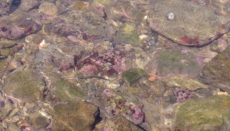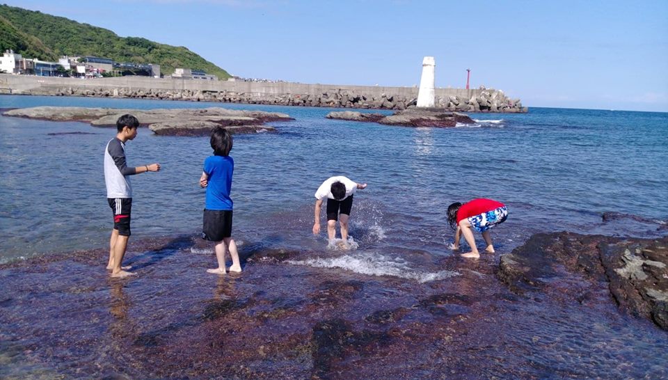 我們站在一塊長滿海菜的岩石上,這次的潮間帶水位較低很適合在岸邊玩水